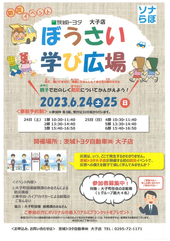 2023年6/24-6/25(土・日)の2日間、茨城トヨタ自動車(株)大子店にて行われる「「茨城トヨタ自動車(株)主催 ぼうさい学び広場」に出展いたします。