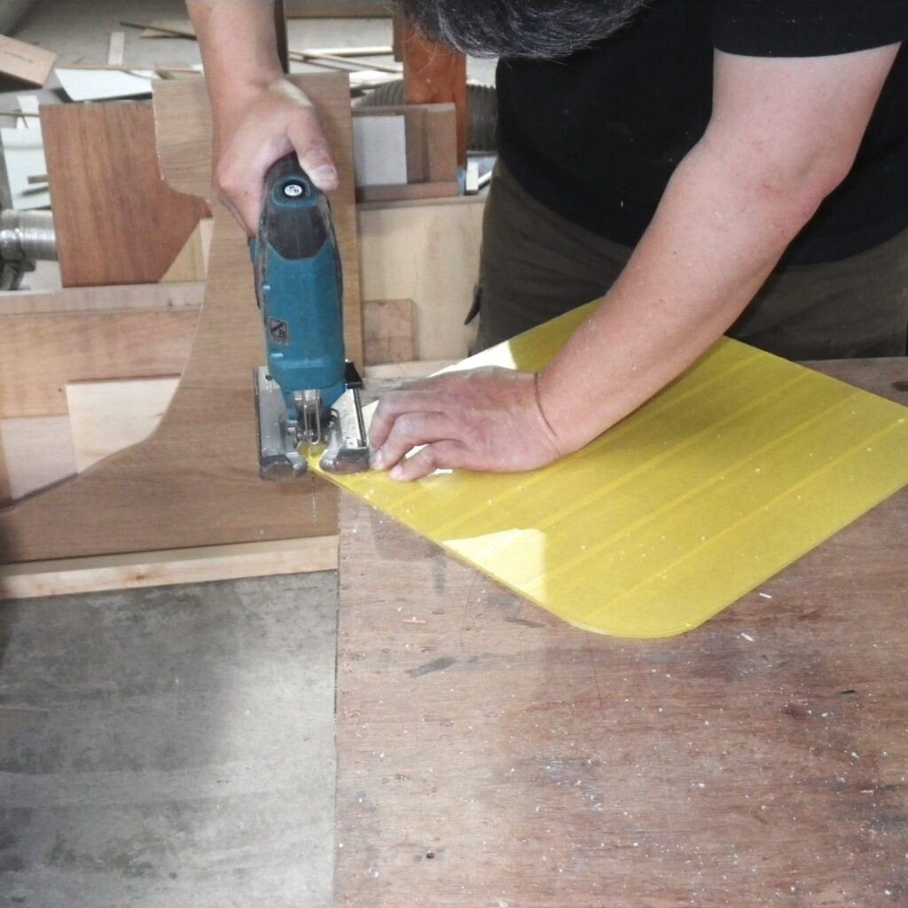 窓が割れたままでは走行もできませんので、とりあえず正規品が入荷するまでの間、アクリル板をカットしてその場をしのぎます。